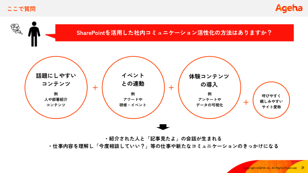 SharePoint外での会話を生むためには、以下のような連動したコンテンツ設計が有効です。