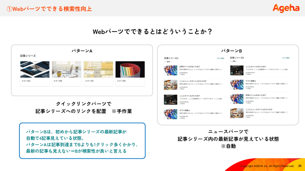 たとえば、クイックリンクで手動配置するよりも、ニュースパーツで最新記事を自動表示した方が、クリック数が減り目的のページへ到達しやすくなります。