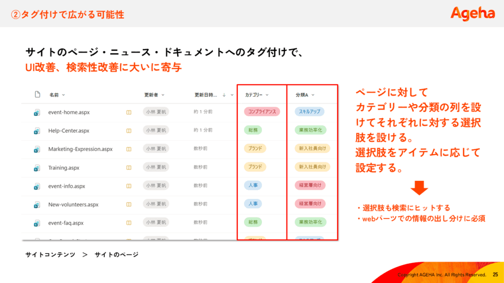 ページやドキュメントに「カテゴリー」や「対象部署」などの列を設けてタグ付けをします。これにより、検索結果にキーワードがヒットしやすくなるだけでなく、特定のタグが付いた記事だけを自動で抜き出して表示することが可能になります。