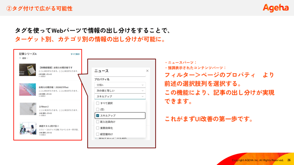また、「ニュースパーツ」「強調表示されたコンテンツパーツ」機能を使用し、設定したタグを指定すれば、ターゲット別やカテゴリー別の情報を自動で出し分けることができます。
