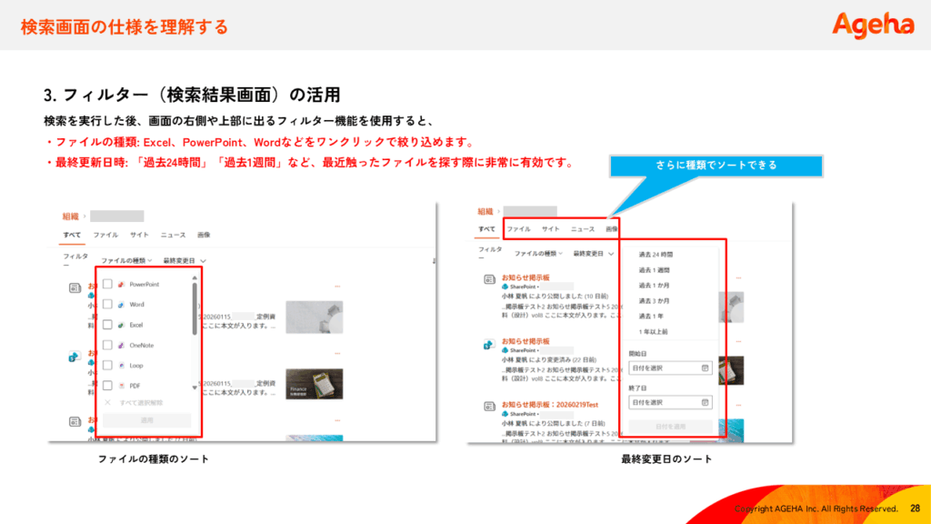 検索結果画面の右側や上部にあるフィルターを使えば、ファイル形式(Excel、PDFなど)や、最終更新日時(過去24時間以内など)で瞬時に絞り込みが可能です。