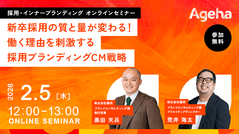本セミナーでは、自社の「事業の社会的価値」をメッセージすることで、採用の「質と量」を劇的に変え、同時に社員のエンゲージメント向上にもつながる「採用ブランディングCM」の最新手法を、成功事例と共に解説します。